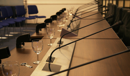 In bijpassende stijl zijn persconferentietafels ontwikkeld, voorzien van techniek voor o.a. live stream beeld en geluid.