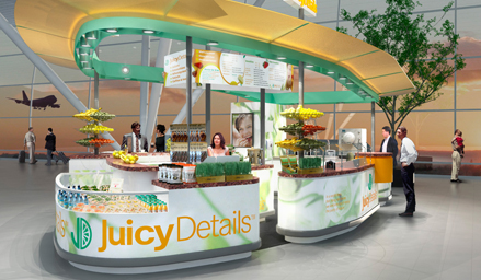 Nieuw concept en ontwerp voor deze juicebar formule met twee pilotvestigingen op Schiphol en in Woonmall Alexandrium Rotterdam. De plattegrond van de unit op Schiphol is ontstaan door optimaal gebruik te maken van de geboden ruimte. Op andere locaties kan de vorm anders zijn met behoud van de herkenbaarheid. De counter is op diverse plaatsen open 'geknipt' om het contact tussen klant en personal juicer te vergroten. Dankzij de opstelling worden de sappen altijd in het zicht van de klant bereid.