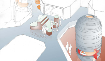In de centrale hal, verspreid over een aantal verdiepingen, is een aantal maatwerk elementen toegepast. Daarmee is dit entree- en verkeersgebied verblijfsruimte geworden waarin kortdurende ontmoetingen kunnen plaatsvinden tussen personeel en klanten. Neon ringen maken de entree van buiten af zichtbaar. Het zitje in de vorm van een opvallend gedetailleerde koker vormt een eyecatcher.