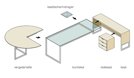 Het maatwerk bureau met vergaderextensie, sidetable en beeldschermstandaard kan op diverse manieren geschakeld worden zodat het in verschillende ruimten toepasbaar is. De wandkast is in dezelfde materialencombinatie uitgevoerd.
