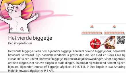 Naast de verhaallijn zijn tal van noten opgenomen met persoonlijke ervaringen, voorstellen voor verhaalvarianten en extra informatie. En naast noten zijn er verschillende soorten illustraties, foto's, QR-codes, opdrachtjes, stickers, kleurplaten en ga zo maar door opgenomen. Zo is van het huis van Het Vierde Biggetje - gebouwd met sloopauto's - een bouwplaat opgenomen. Kortom, het zijn voorleesverhalen om van af te dwalen.